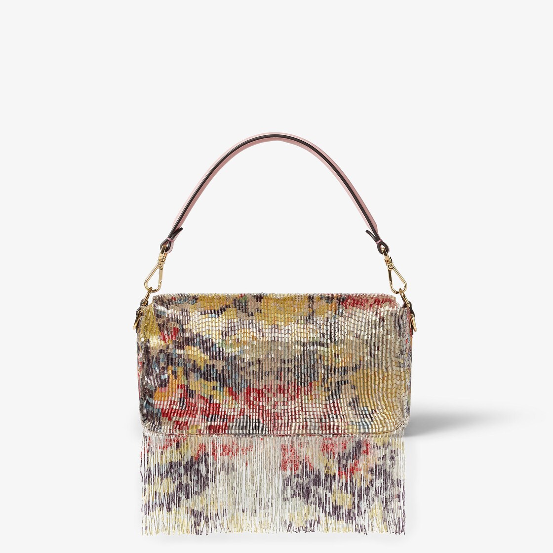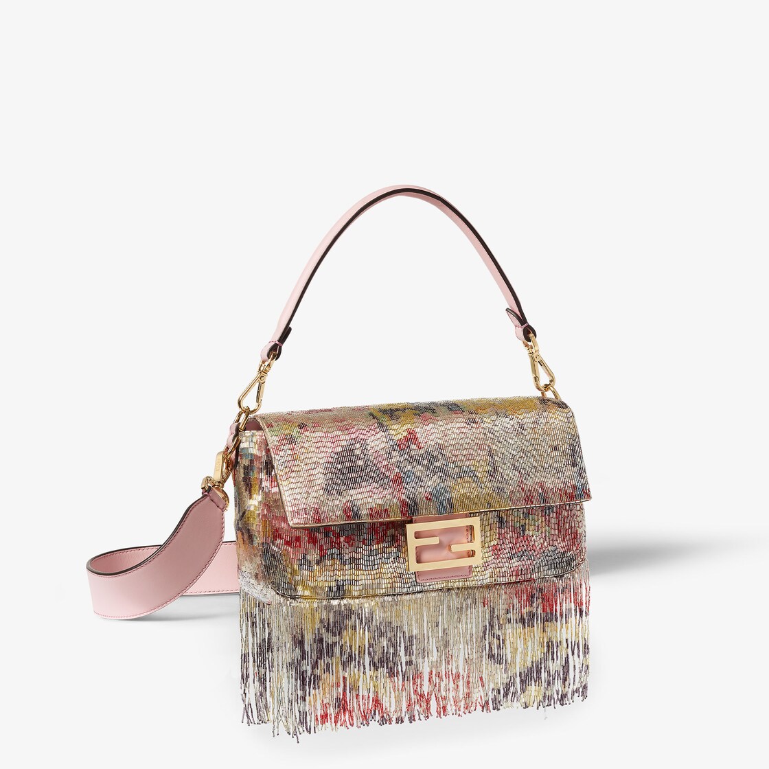 Interamente ricamata a mano con canottiglie di vetro multicolor che disegnano un motivo floreale astratto, arricchito da lunghe frange sospese. La speciale combinazione di tecniche di ricamo richiede oltre 400 ore di lavorazione artigianale. Decorata con chiusura FF.