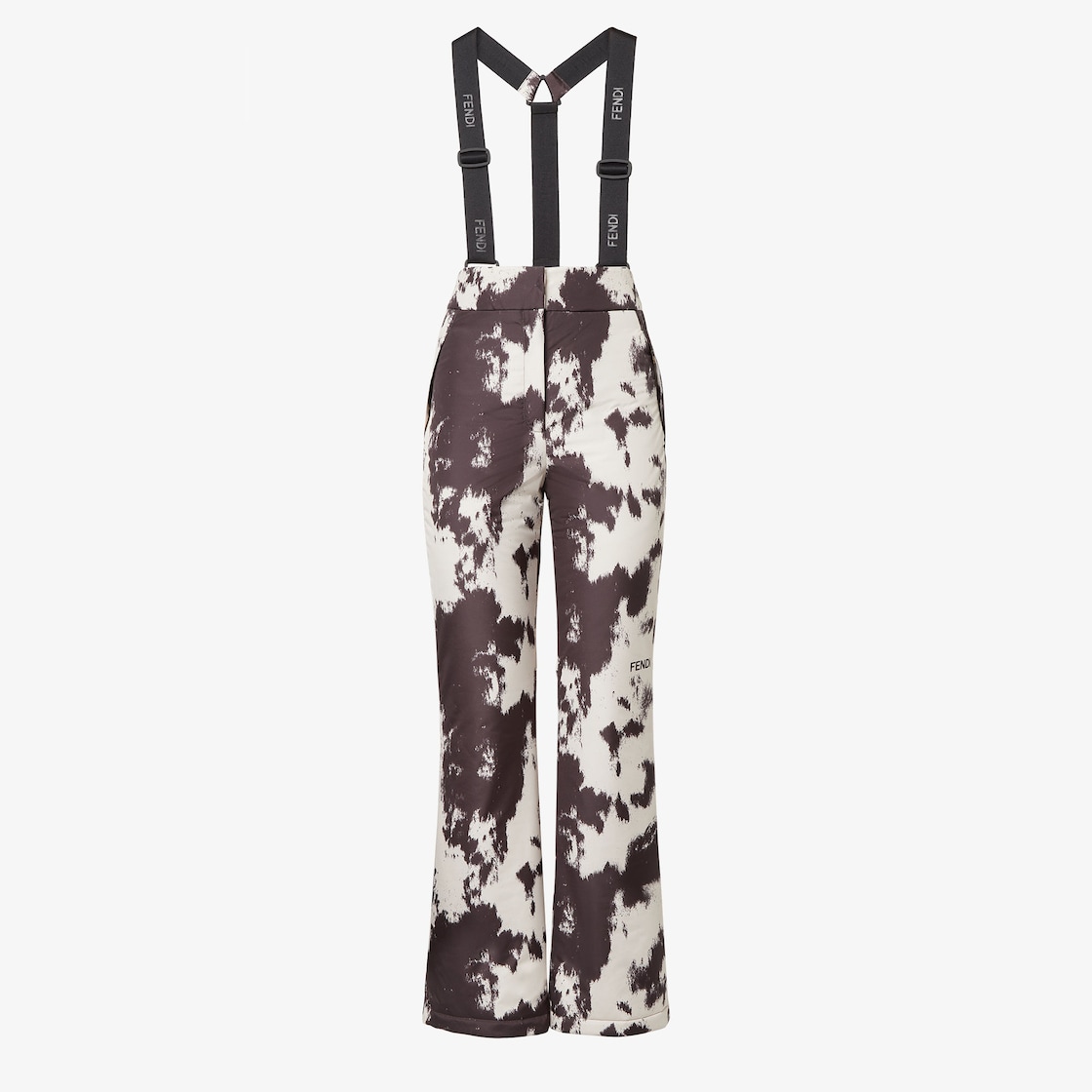 Tuta da sci modello salopette, con vita accostata e bretelle stretch regolabili con lettering Fendi jacquard. Chiusura con mezza zip sul davanti. Realizzata in tessuto tecnico con l'esclusivo motivo Frosted Fauna stampato all over: una reinterpretazione sfumata del classico animalier nei toni del bianco e nero, ispirata a un cappotto d’archivio di Silvia Venturini Fendi.