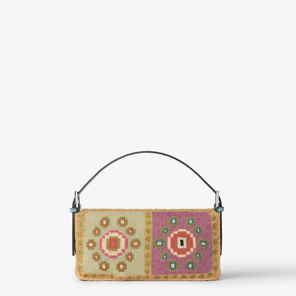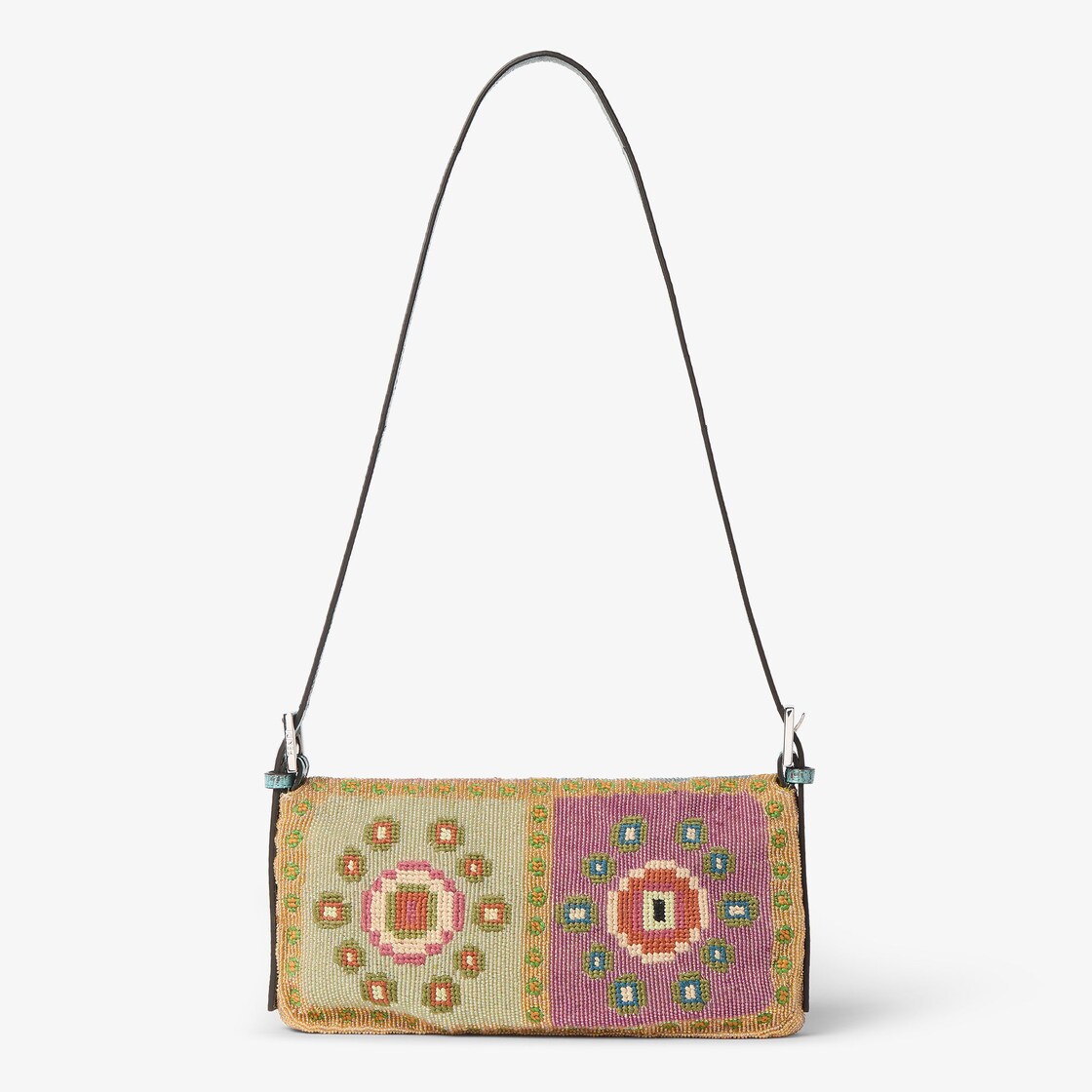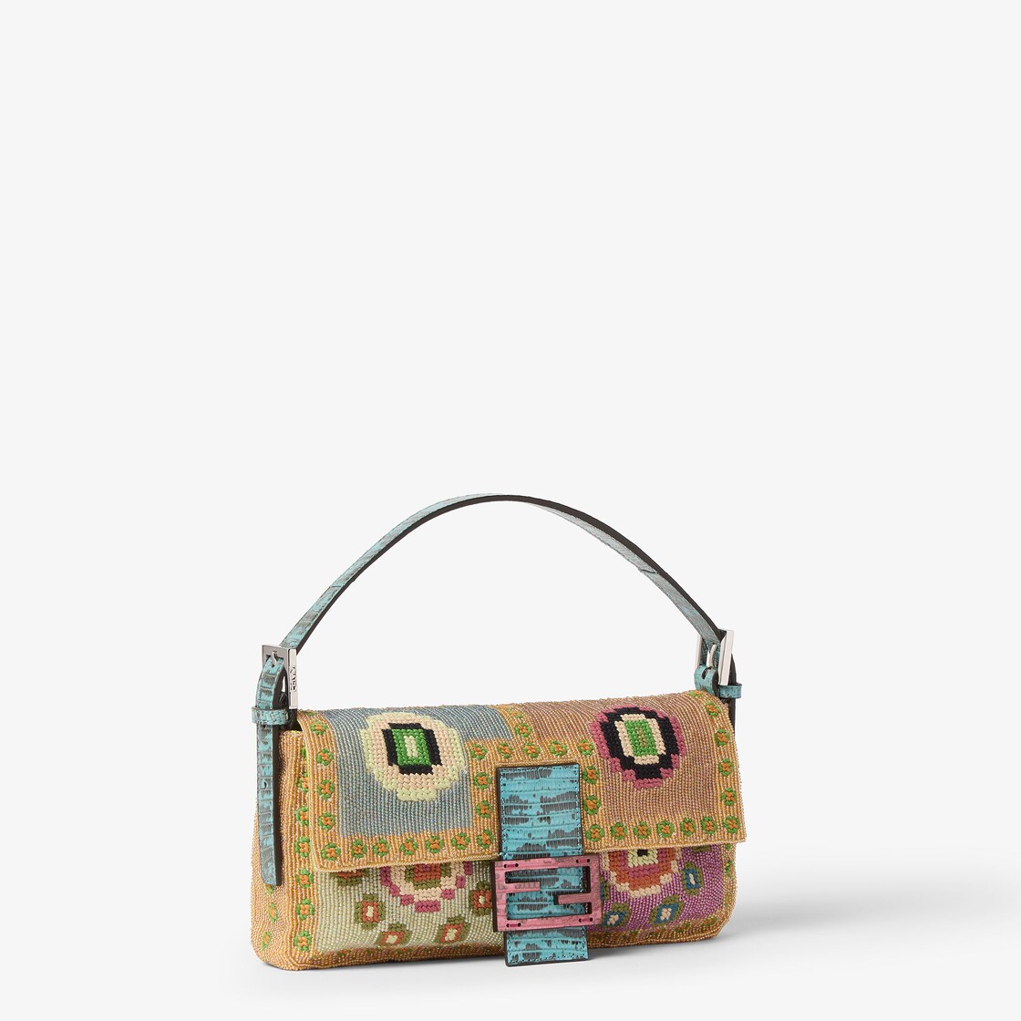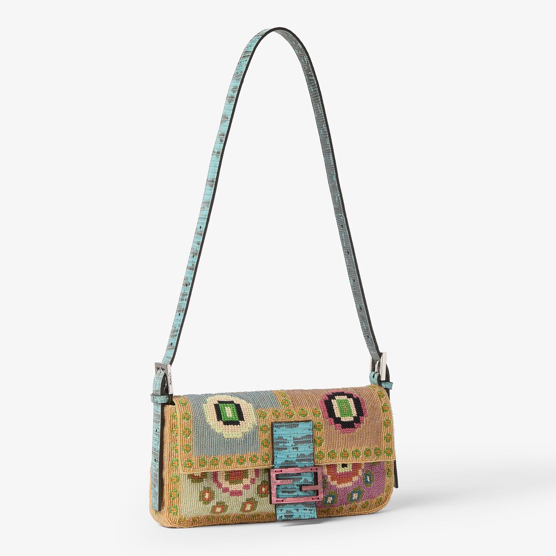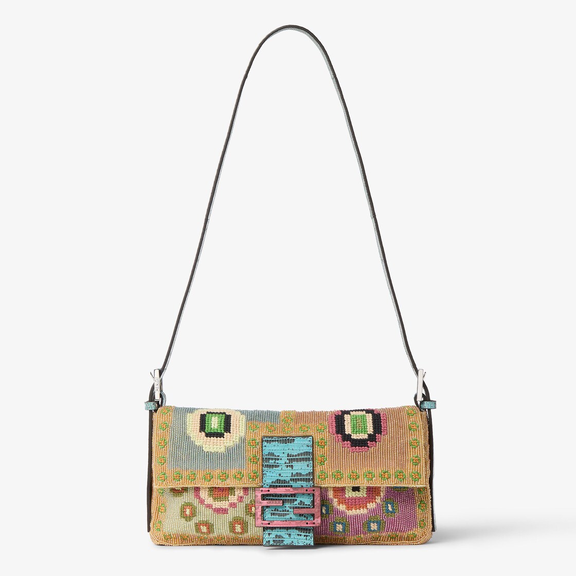 Icona della Maison fin dal 1997, ricreata per la collezione Autunno/Inverno 2026-27 sul modello della versione originale, numero 26424. Interamente ricamata a mano in una pregiata combinazione di texture, con 51.400 perline e lavorazioni in filo che creano un motivo multicolor, per oltre 173 ore di lavorazione artigianale. La borsa Baguette® presenta manico e tracolla in pregiata pelle di lucertola Tejus di colore azzurro, regolabili e rimovibili per la massima versatilità, oltre alla caratteristica fibbia FF in lucertola Tejus a contrasto. Completano l’accessorio una patta anteriore con chiusura magnetica, un interno interamente foderato in raso di colore verde acido e una tasca interna con cerniera. Placca Re-Edition e dettagli in metallo con finitura palladio.