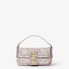 Icona della Maison fin dal 1997, ricreata per la collezione Autunno/Inverno 2026-27 sul modello della versione originale, numero 26424. Interamente ricamata a mano in una raffinata combinazione di texture e tonalità pastello con 39.500 perline e 475 specchi, per oltre 138 ore di lavorazione artigianale. La borsa Baguette® presenta manico e tracolla in pregiata pelle di lucertola Tejus di colore pergamena, regolabili e rimovibili per la massima versatilità, oltre alla caratteristica fibbia FF con finitura palladio. Completano l’accessorio una patta anteriore con chiusura magnetica, un interno interamente foderato in lino lario e una tasca interna con cerniera. Placca Re-Edition e dettagli in metallo con finitura palladio.