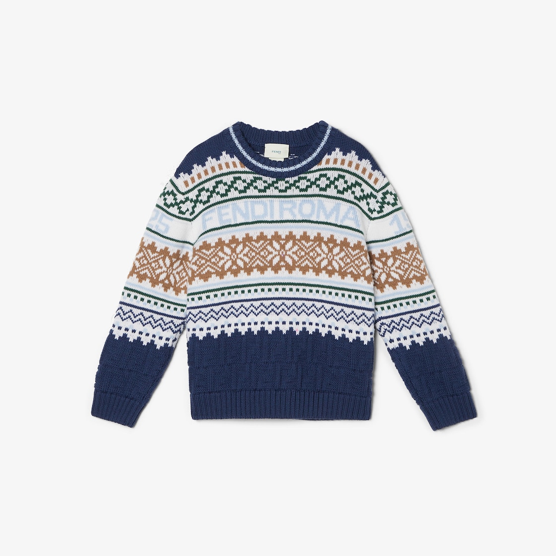 Maglione junior girocollo in lana blu con intarsio multicolor stile norvegese sul davanti e logo FF blu tone on tone sul fondo.