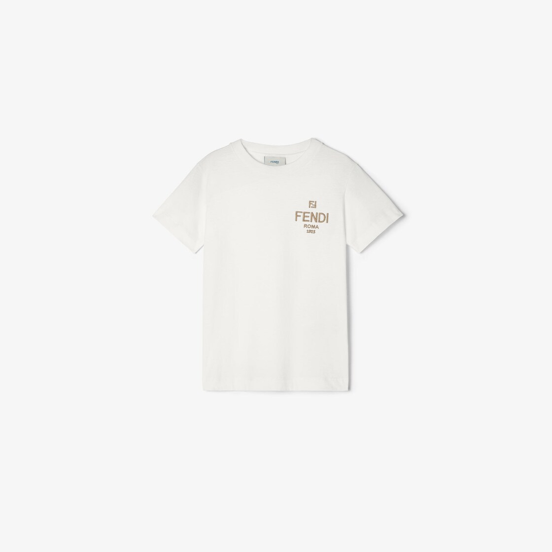 T-shirt junior in jersey bianco con ricamo Fendi Roma beige sul davanti.