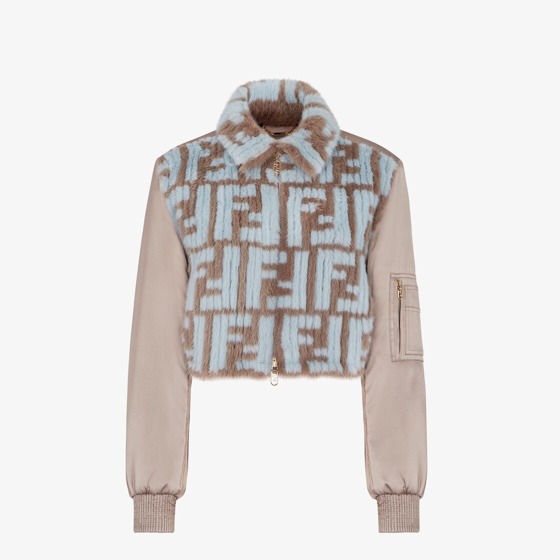 Bomber corto, chiuso con zip a doppio cursore. Collo a camicia e maniche in maglia a coste. Bordo a coulisse e taschino zip sulla manica destra. Realizzato in visone color tortora, con motivo FF stampato all over nei toni dell'azzurro. Schiena e maniche in satin color tortora. La particolare lavorazione Featherlike su base di chiffon rende il capo estremamente leggero da indossare. Chiusura nascosta da piping in satin.