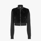 Giacca crop con collo alto e maniche lunghe. Tasche a filetto verticale. Chiusura frontale con zip a doppio cursore. Realizzata in soffice visone nero, scolpito per creare un motivo a coste tridimensionale. Impreziosito da una lavorazione a telaio che ricrea all over l'iconico motivo FF diagonale a pelo lungo. Rifinita con collo, maniche e bordo in maglia a coste tono su tono.