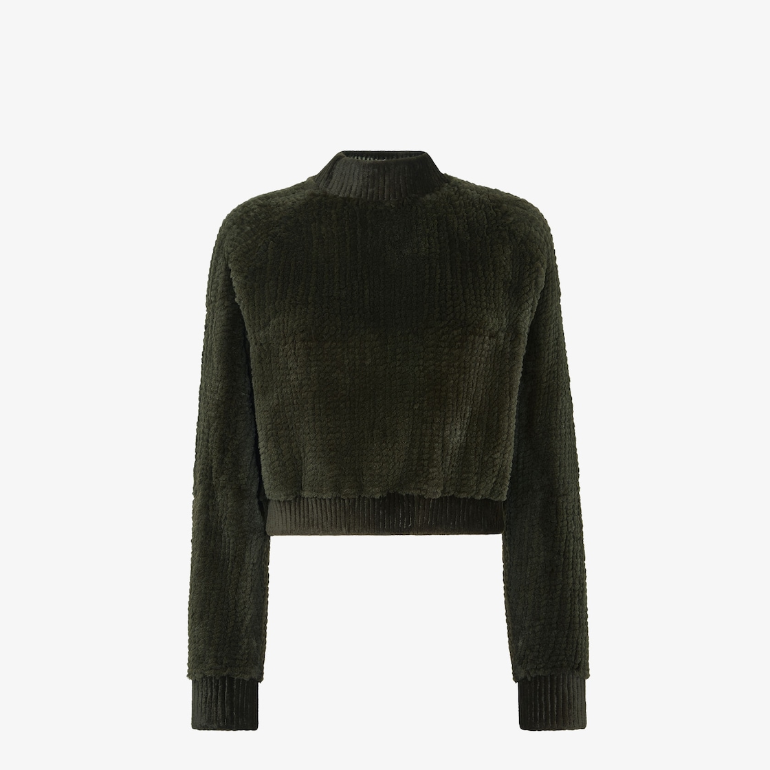 Maglia dolcevita con maniche lunghe raglan. Modello dalla vestibilità boxy con taglio cropped in vita. Realizzato in visone di colore verde scuro, dalla particolare lavorazione tricot. Rifinito con collo, polsi e bordo a coste.
