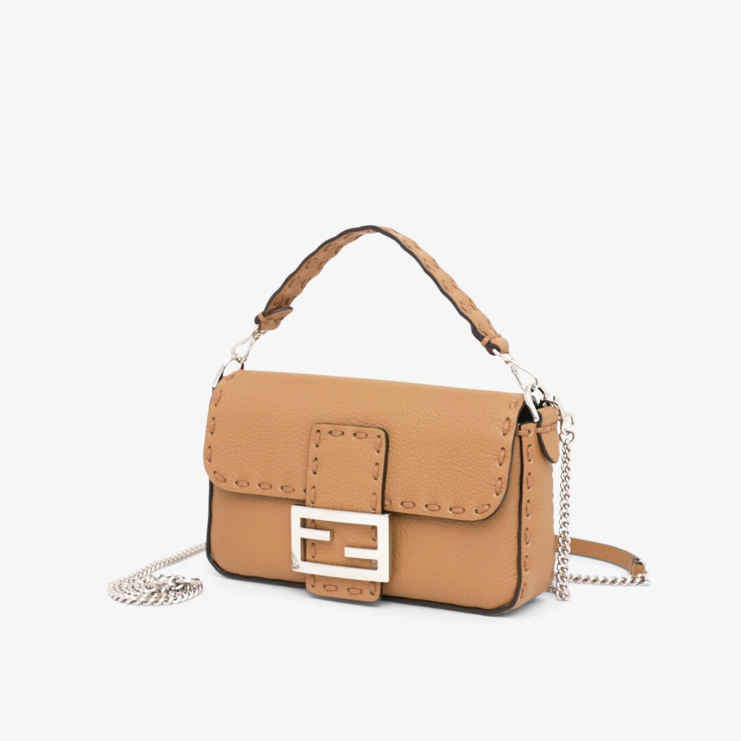 Iconica borsa Baguette® misura mini, realizzata con 309 macro impunture tono su tono fatte a mano, emblema dell’iconica lavorazione Selleria, tramandata dagli artigiani Fendi sin dal 1925.