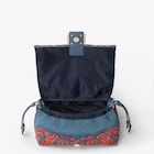 Ampio scompartimento interno sfoderato con chiusura a coulisse, con laccetti in pelle di colore blu e dettagli personalizzati.