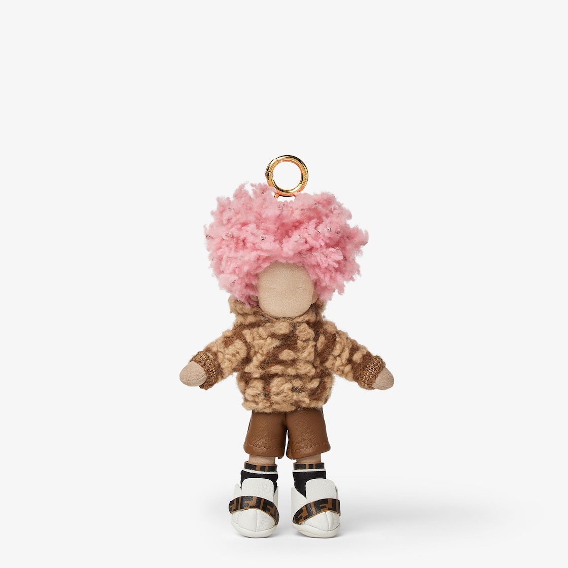Bag charm Bread realizzato in camoscio con capelli in montone rosa. Maglia in lana con iconico motivo FF nei toni del marrone. Bermuda in pelle e sneaker in pelle bianca con dettaglio FF. Loop in pelle con moschettone e logo Fendi Roma a caldo applicato sul retro. Accessori metallici con finitura dorata. Ideale per personalizzare il look delle borse di collezione.