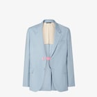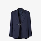 Blazer monopetto con spacco centrale sul retro. Rever, taschino sul petto e tasche a filetto con patta sul davanti. Chiusura con bottoni ricoperti. Realizzato in tela di lana di colore blu scuro. Il capo è dotato di cinturino rimovibile in pelle nera con dettaglio Fendi in metallo e asole per modulare la vestibilità e definire il volume della silhouette. Rifinito con FF Selleria ricamato sulla manica. Semifoderato in cupro micro FF in tono.
