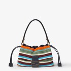 Realizzata in rafia e cotone intrecciati crochet a righe multicolor, decorata con chiusura FF con inserto in pelle di vitello di colore blu notte.