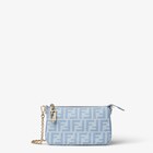Pouch Baguette realizzata in denim FF di cotone organico con lavaggio blu chiaro. Chiusura con zip e tirazip con iconico motivo FF.
