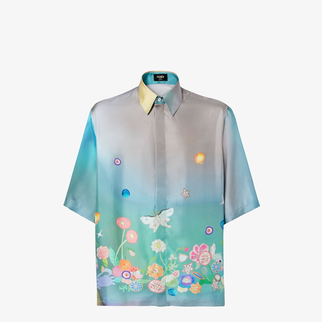 Camicia a maniche corte dalla linea oversize. Collo mezzo italiano e fondo dritto. Chiusura con bottoni nascosti. Parte della capsule "Fantastic Fendi Future", disegnata in collaborazione con l’artista giapponese AYA TAKANO, è realizzata in seta sfumata nei toni dell'azzurro con stampa Fantastic Flowers multicolor.