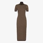 タイトフィットのミディ丈ドレス。ハイネック、半袖。アイコニックなブラウンのFFモチーフをジャカードであしらったコットンニット製。縁は無地のリブ。