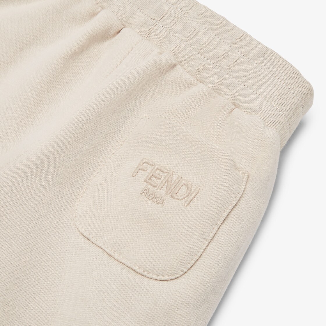 ウエストにドローストリングを備えた、リバーシブルのベビー用ジョガーパンツ。片面はベージュのジャージーに同色でFENDIの文字を刺繍したデザイン。反対面はナイロン素材にタバコカラーのFFロゴをあしらった総柄。