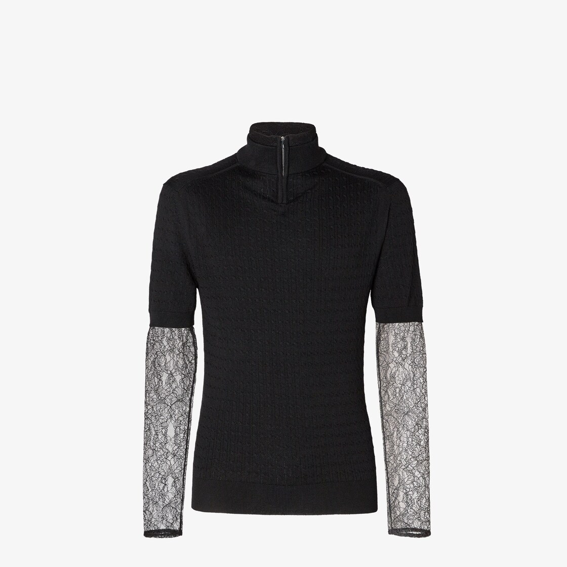 長袖のポロネックセーター。リブで仕上げた縁。背面にジップ ファスナー。ブラックのウールヤーンを使用し、全面にケーブル編みのモチーフをあしらったデザイン。袖に個性的なブラックレースの切替えを付けることでダブルレイヤー効果を演出。襟の背面には小さなボタンを添えました。