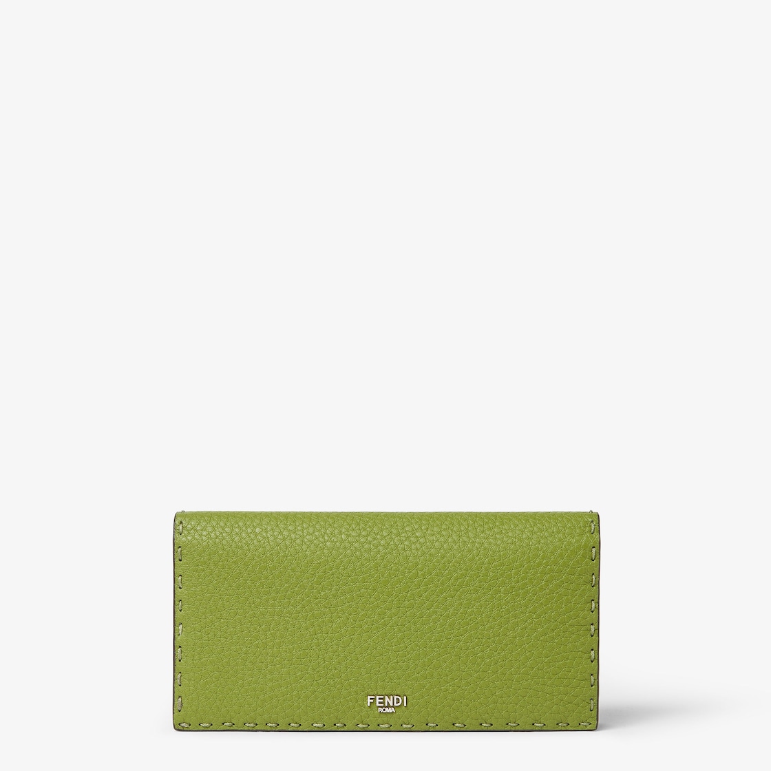 カードスロットx14、フラットポケットx3、ジップ付きポケットx1を備えた長財布。バーベナグリーンのカーフレザーを使用し、141目のマクロトップステッチを手作業で施しました。1925年以来何世代にもわたりFendiの職人に受け継がれてきたアイコニックなセレリアのステッチが際立ちます。コントラストが映えるブラックレザーのライニング。メタルのFENDI ROMAロゴはパラジウム仕上げ。