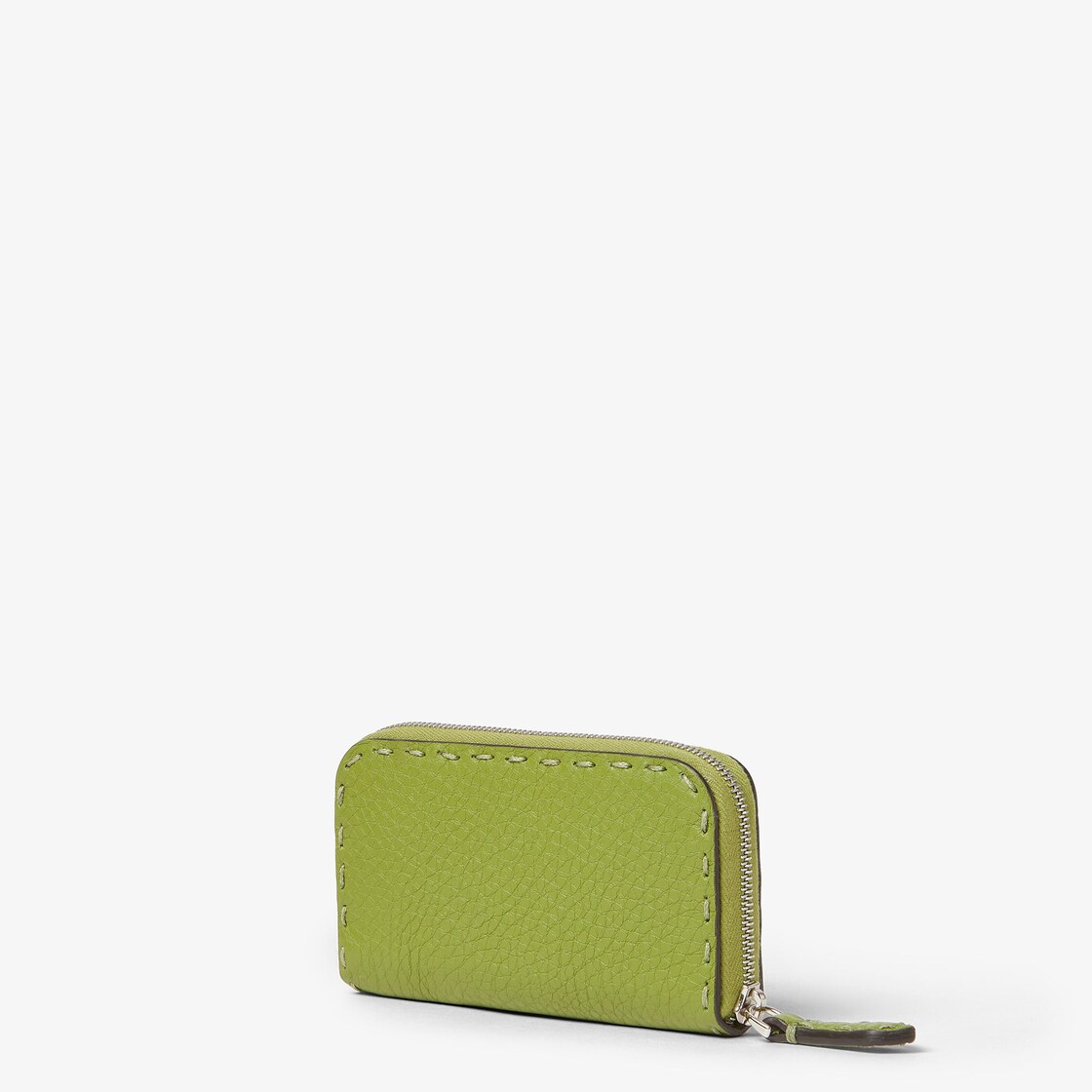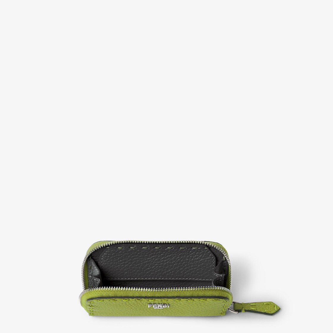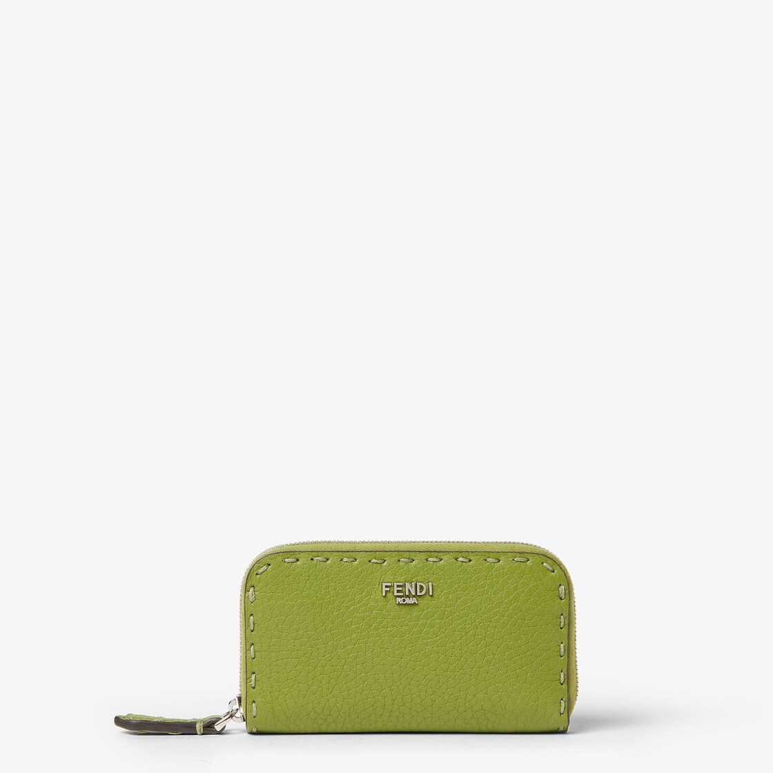 ミニサイズのジップファスナー付きセレリア財布。コイン入れを備えたシングルマチ付きコンパートメント。バーベナグリーンのカーフレザーを使用し、92目のマクロトップステッチを手作業で施しました。1925年以来何世代にもわたりFendiの職人に受け継がれてきたアイコニックなセレリアのステッチが際立ちます。コントラストが映えるブラックレザーのライニング。メタルのFENDI ROMAロゴはパラジウム仕上げ。