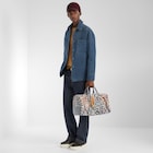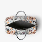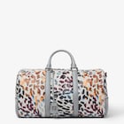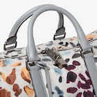 ラグジュアリーでわずかにエンボスの質感があるライトグレーのパディング入りFFナイロン素材を使用したミディアムサイズのトラベルバッグ。マルチカラーのFendiファレナプリントが特徴です。ライトグレーのカーフレザーのトリミングにFendi Romaロゴのプリントをあしらったチャーム付き。