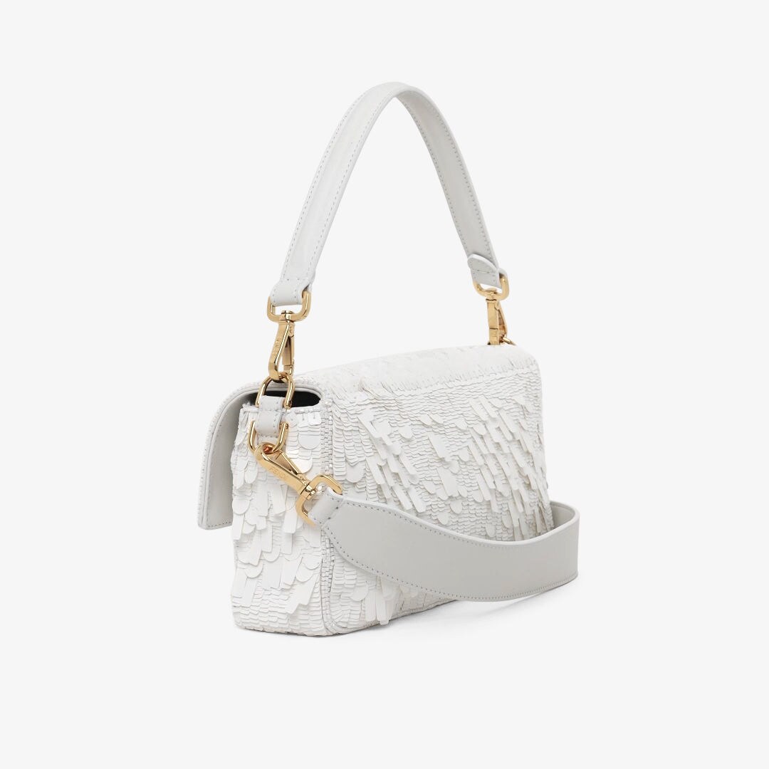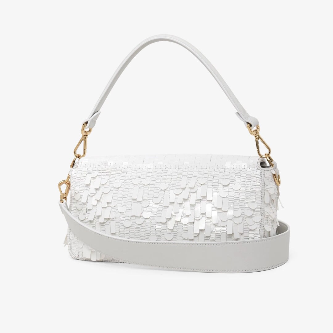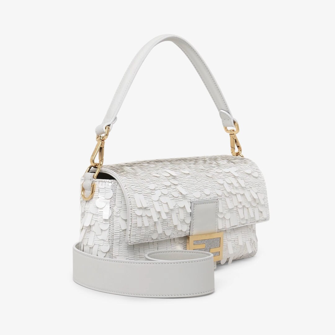 全体にフォルムとサイズの異なるメタリックなホワイトのスパンコール刺繍を施した、ミディアムサイズのアイコニックなバゲットバッグ。FFモチーフの留め具を飾ったデザイン。