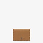 フラットポケットx2、メインコンパートメント、背面にフラットポケットx1を備えたフラットなカードケース。ダークグリーンのカーフレザーに、コントラストの効いたマクロトップステッチを手作業で施しています。1925年以来何世代にもわたりFendiの職人に受け継がれてきたアイコニックなセレリアの職人技が光ります。グレーのカーフレザーのライニング。メタルパーツはパラジウム仕上げ。