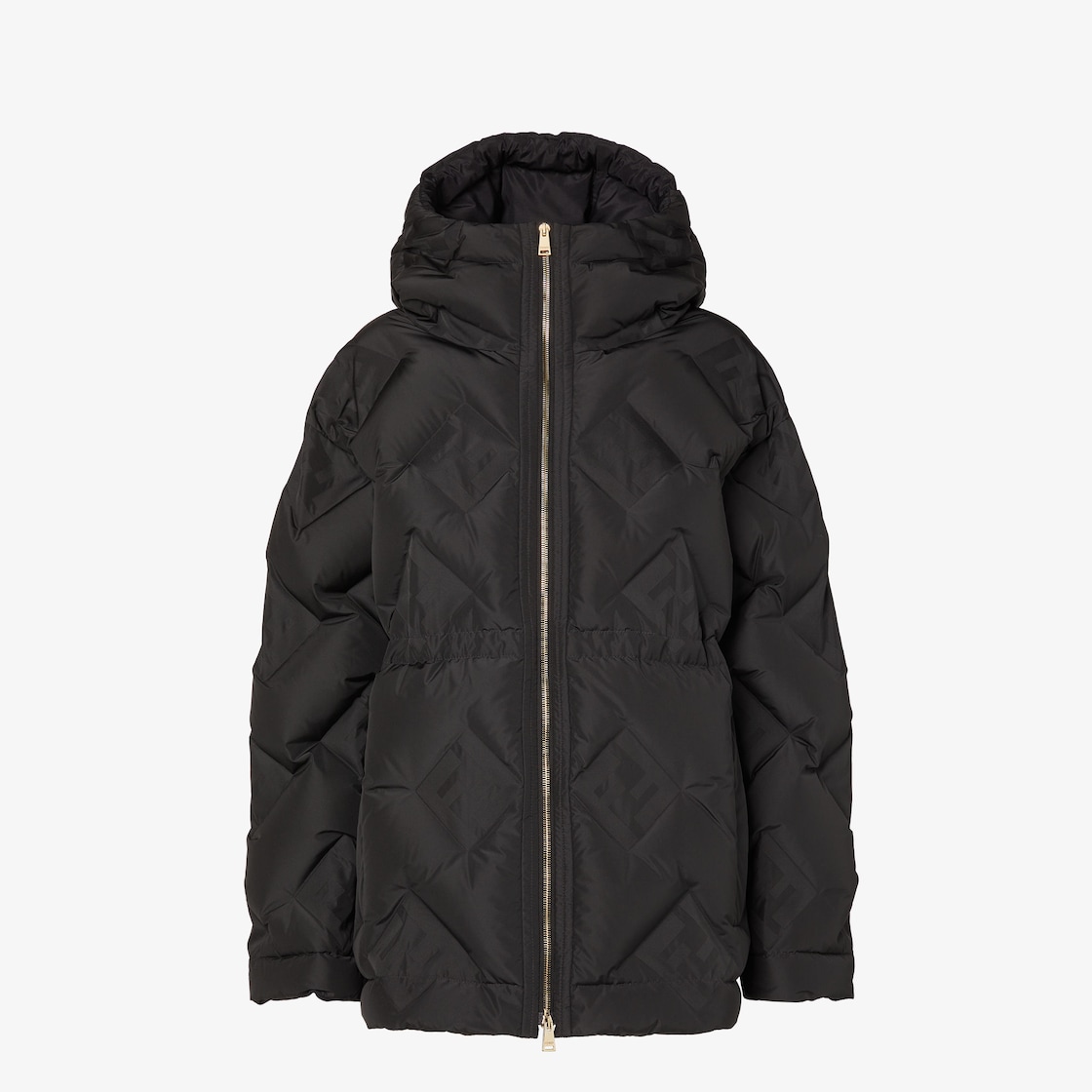 ハイカラーとフードをあしらい、パディングで仕上げたミディパーカー。ドロップショルダーのロングスリーブ、ウエストの内側にドローストリング。サイドポケット。メタル製ダブルジップ ファスナー。全面にエンボス風のFFジャカードモチーフを斜めにあしらった、ブラックのテクニカルファブリックを使用。メタルパーツはゴールド仕上げ。