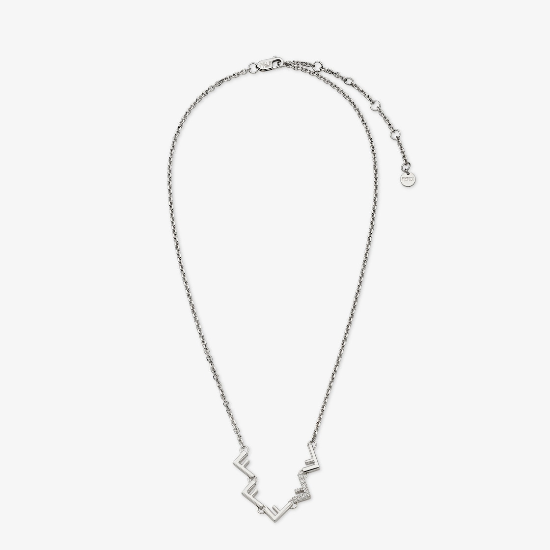 細身のチェーンに小さなスプリング クリップの留め具と、Fモチーフの連なるディテールをあしらったデザイン。パラジウム仕上げのメタル製。フェンディ5姉妹をイメージした、5つのFモチーフの装飾。クリアカラーのクリスタルを飾ったFモチーフ。