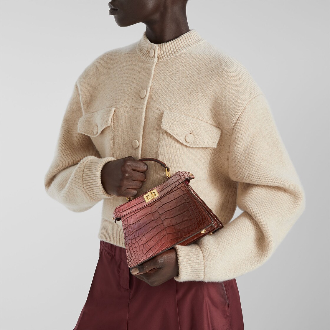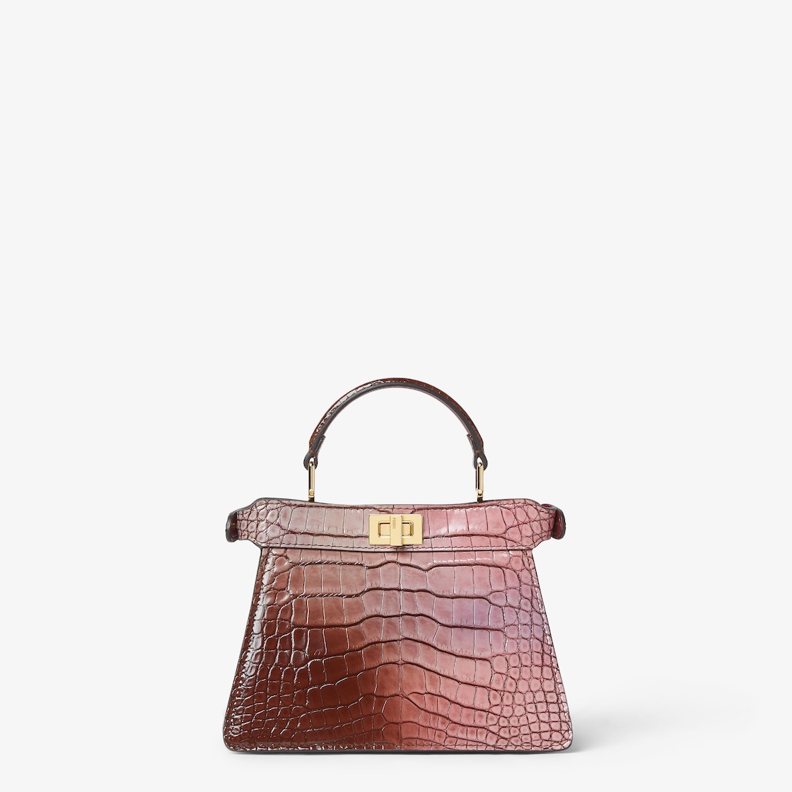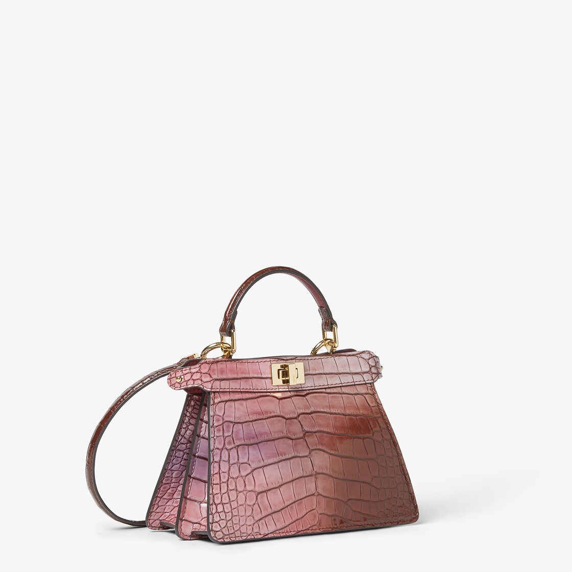 ラグジュアリーなクロコダイルレザーを使用。エアブラシを用いて手作業で加工を施し、ピンクトーンのグラデーション効果を作り出しています。カラートーンによりバッグ一つひとつに個性があり、同じものはひとつとしてありません。