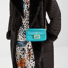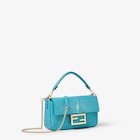 手作業で光沢を出した、ターコイズカラーのスティングレイレザーを使ったアイコニックなバゲット® ミニバッグ。FFモチーフの留め具。