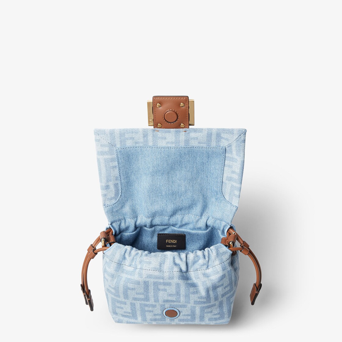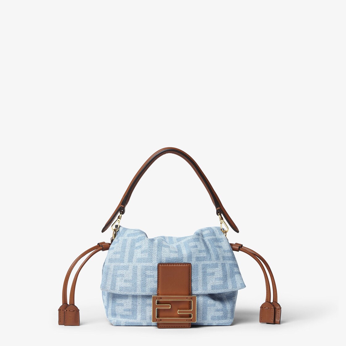 ライトブルーのウォッシュ加工のオーガニックコットンFFデニム製。FFモチーフの留め具とブラウンレザーのインサート。