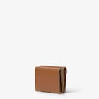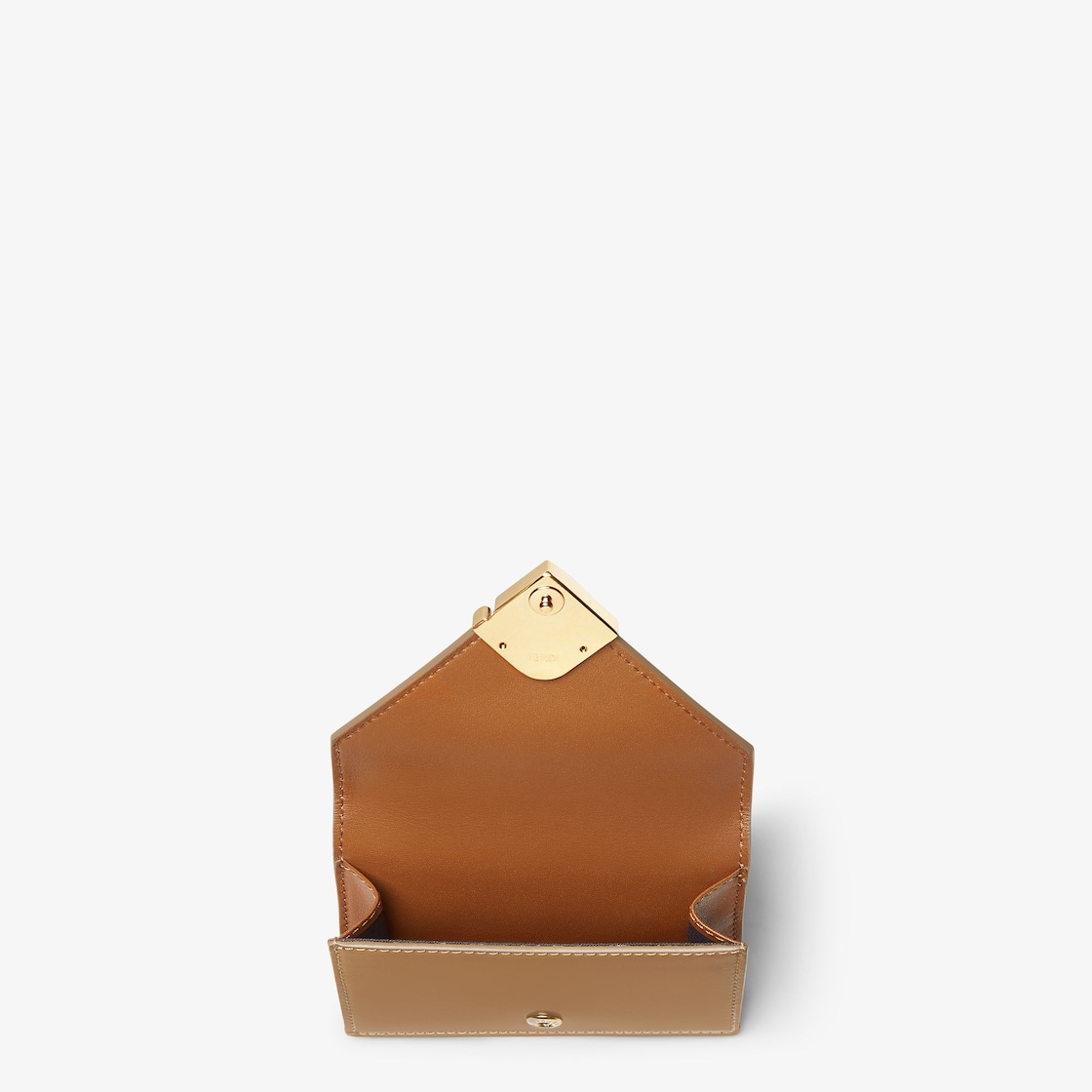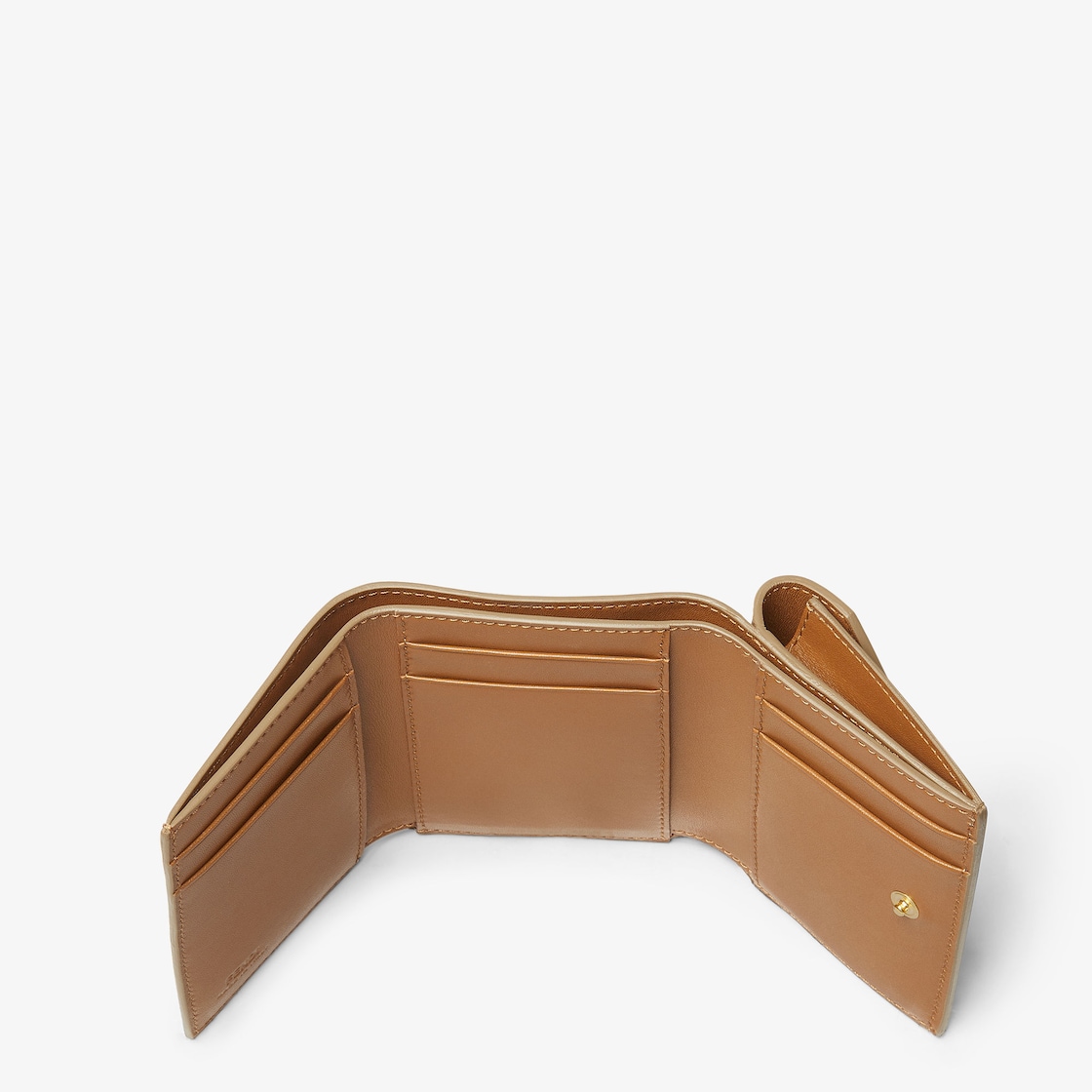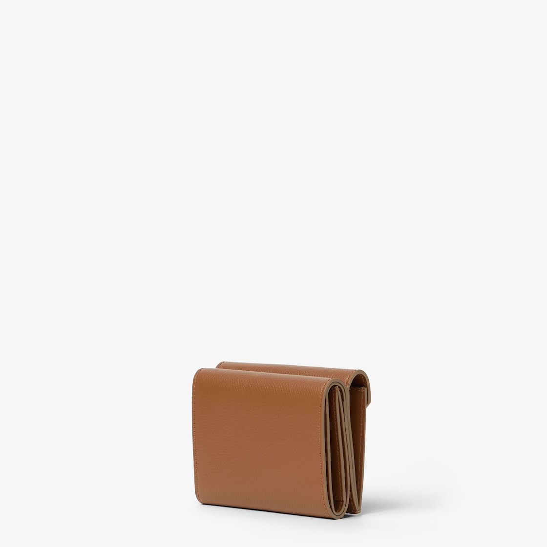 幾何学的なフラップと斜めのFFロゴをあしらった、ミディアムサイズのFFダイヤモンド三つ折り財布。カードスロットx6、紙幣用コンパートメントx1、スナップボタン付きコインポケットx1を備えたデザイン。タンカラーのフルグレインカーフレザーとライトブラウンのスムースレザーを使用。メタルパーツはゴールド仕上げ。