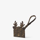 トナカイの顔にデザインした、フェンディ ベストフレンズフォーエバー カードケース。ブリッジの付いた留め具と隠しスナップボタンが付いた内側のコンパートメント。バッグやベルトに付けるレザーストラップ。タバコブラウンのFFファブリックを使用。マルチカラーのレザーのディテール。メタルパーツはゴールド仕上げ。