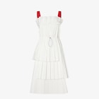 スカートにアシンメトリーなパネルを配したミディビスチェドレス。ウエスト前面に調節可能なドローストリングを配しています。背面にはカットアウトのディテール。伸縮性のあるストラップとショルダーストラップ付き。背面にジップ ファスナー。ホワイトのファイユを使用。全面にフラットプリーツのモチーフ。コントラストの効いたレッドのショルダーストラップと背面の伸縮素材。