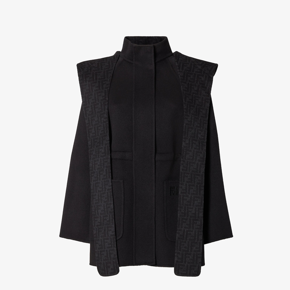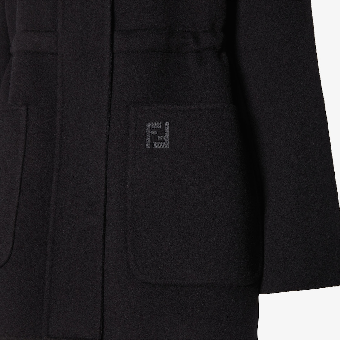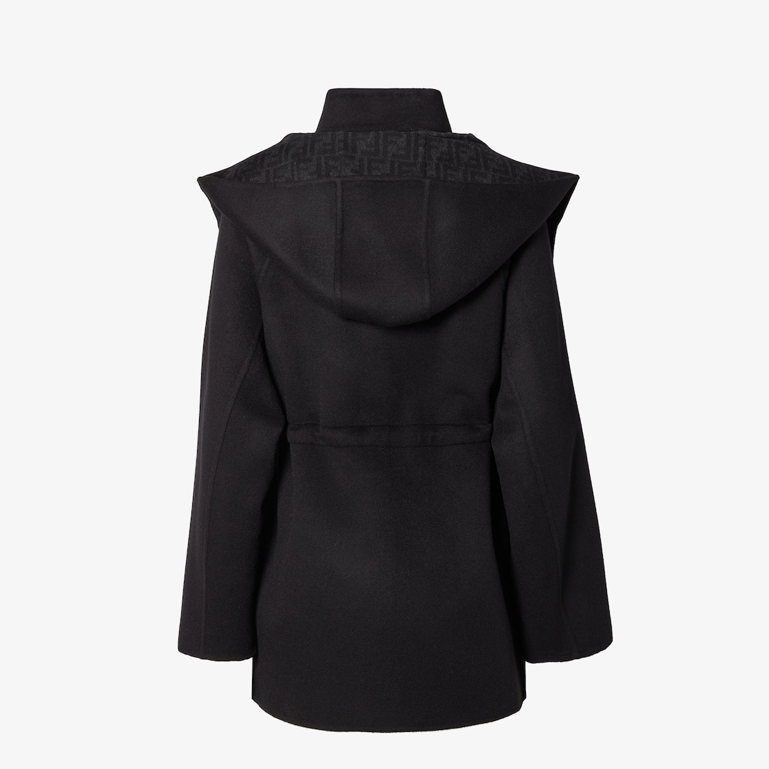 ウエストに調整可能なドローストリング、取り外し可能なフードをあしらった、パーカースタイルのブルゾン。ハイネック、ラグランスリーブ、パッチポケット付き。ダブル スライダーの付いたコンシールファスナー。ブラックのウール製ダブルファブリック製。グレーのFFモチーフ入りライニング。スカーフ風の切替えでダブルレイヤー効果を出したフード。左のポケットに同色のFFロゴ刺繍。