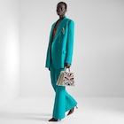わずかに長めのシルエットのダブルブレストブレザー。ピークドラペル、長袖、胸ポケット。フロントフラップが付いたウェルトポケット。同系色のクルミボタンで開閉。ターコイズに仕上げた、ウールのグランドプードルを使用。クラシックなダブルブレスト仕様、中央のボタンだけ留めてリラックスしたフィットを演出することもできます。