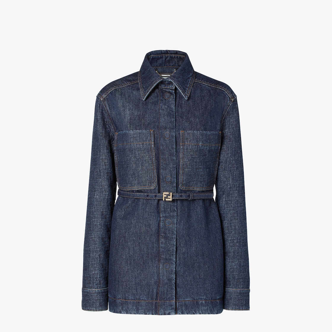 シャツカラーと低い位置までアームホールを開けたセットインスリーブが特徴的な、シングルブレストのGo-To ジャケット。メタルのFFバックルで留める共布ベルト付き。胸にオーバーサイズのパッチポケット。ダークブルーのコットンデニム製。ポケットと袖に斜めのキルティングのFFモチーフを施したデザイン。コントラストの効いたタバコカラーのステッチ。襟裏にレザーのFendi Romaパッチ。