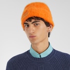 ブリムを折り返したビーニー。オレンジの毛足の長いフェイクファーを使用。前面に同色のFendi Romaのファブリックパッチ。