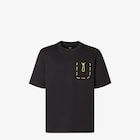 レギュラーフィットの半袖クルーネックTシャツ。ブラックのコットン100%。左側の胸にスモールパッチポケット、フードにセレリアステッチを模したイエローのFendiリボンドローストリングを配しました。