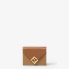 幾何学的なフラップと斜めのFFロゴをあしらった、ミディアムサイズのFFダイヤモンド三つ折り財布。カードスロットx6、紙幣用コンパートメントx1、スナップボタン付きコインポケットx1を備えたデザイン。ブラックレザー製。メタルパーツはゴールド仕上げ。