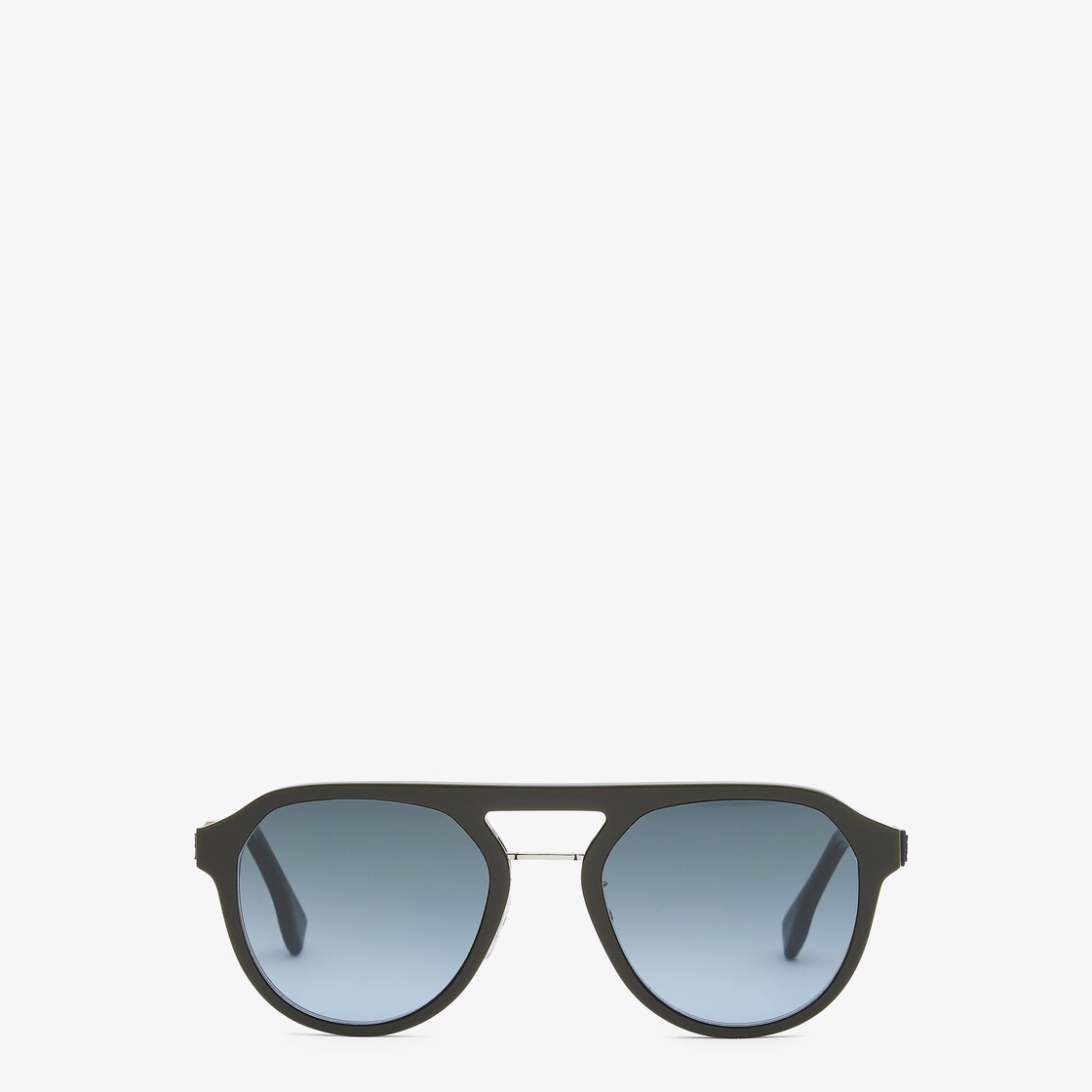 다크 그린 아세테이트 소재의 파일럿 스타일 선글라스. 팔라듐 컬러 메탈 디테일을 더한 더블 브릿지. 레드 메탈 디테일 브랜딩의 엠보싱 FF 패턴 및 그레이 러버라이즈 인서트 템플. 블루 그라데이션 렌즈. Fendi 로고 브랜딩 조절형 노즈 패드.