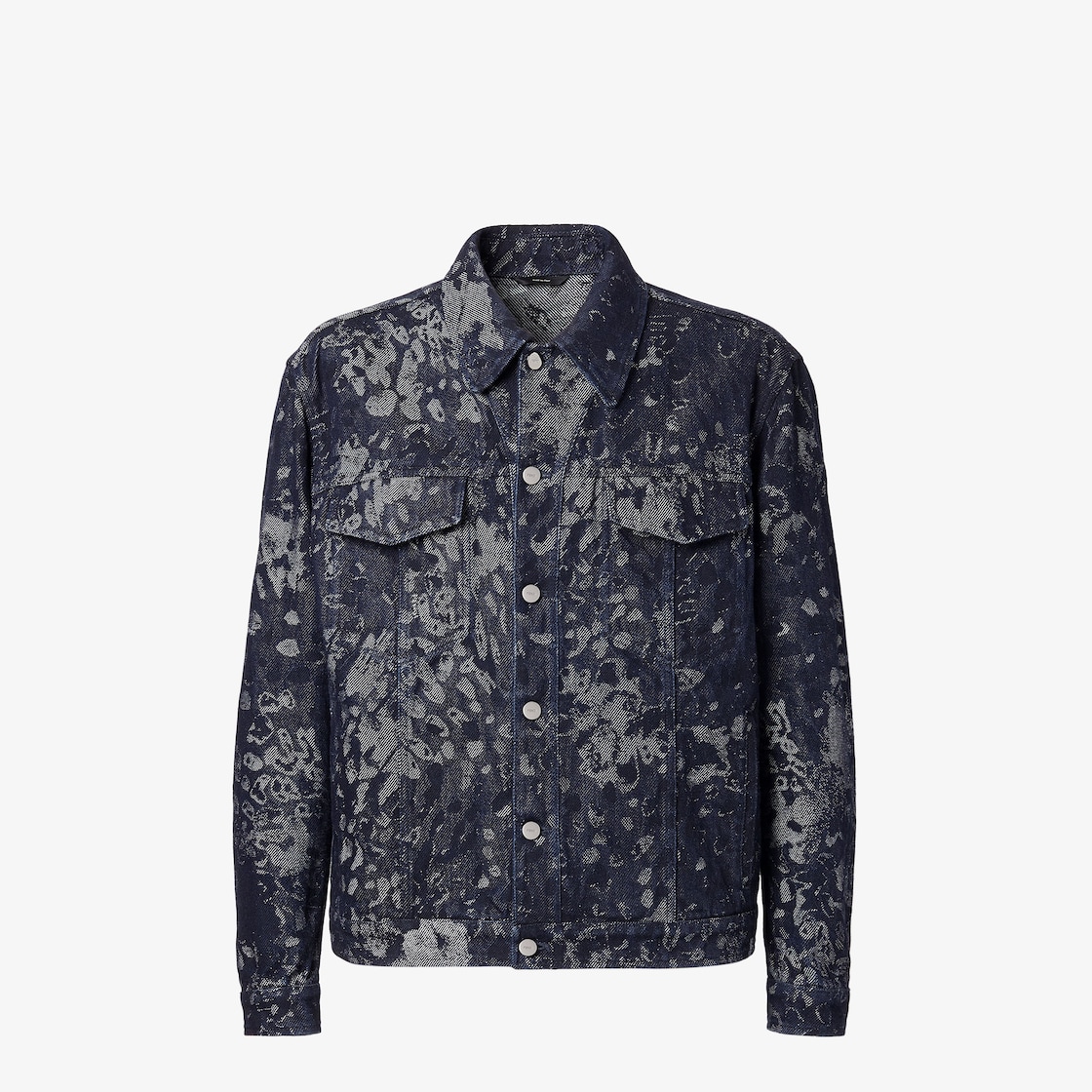 셔츠 칼라와 가슴에 패치 포켓이 있는 오버사이즈 재킷. 안감 없음. 버튼 잠금. 블루 컬러 데님 패브릭 소재. 올오버 팔레나 드롭 자카드 모티프. 로고 버튼 및 가죽 패치 장식, 칼라 뒷면의 엠보싱 펜디 로마 레터링. 팔라듐 피니시 메탈웨어.