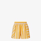 엘라스틱 웨이스트의 쇼츠. 사이드 지퍼 포켓, 뒷면의 더블 웰트 포켓. 데님 소재. 옐로우와 베이지 컬러의 가로 및 세로 스트라이프로 업데이트된 아이코닉 페퀸 스트라이프 모티프. 뒷면 오른쪽 포켓의 셀러리아 FF 디테일, 브라운 컬러 가죽 패치.