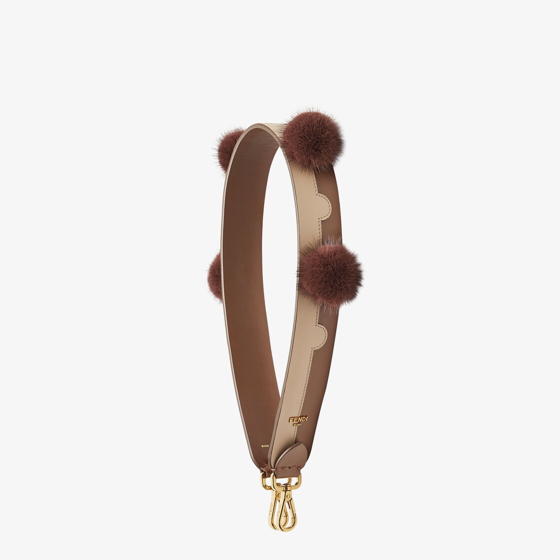 더블 스냅 후크가 있는 롱 숄더 스트랩을 이용해 후크가 있는 모든 백과 함께 사용 가능. 브라운과 베이지 컬러 펜디 도트 디자인의 인레이 가죽 소재. 브라운 컬러 밍크 폼폼 장식. 톤온톤 가죽 디테일 장식. 끝 부분의 메탈 Fendi Roma 레터링 장식. 골드 피니시 메탈웨어.