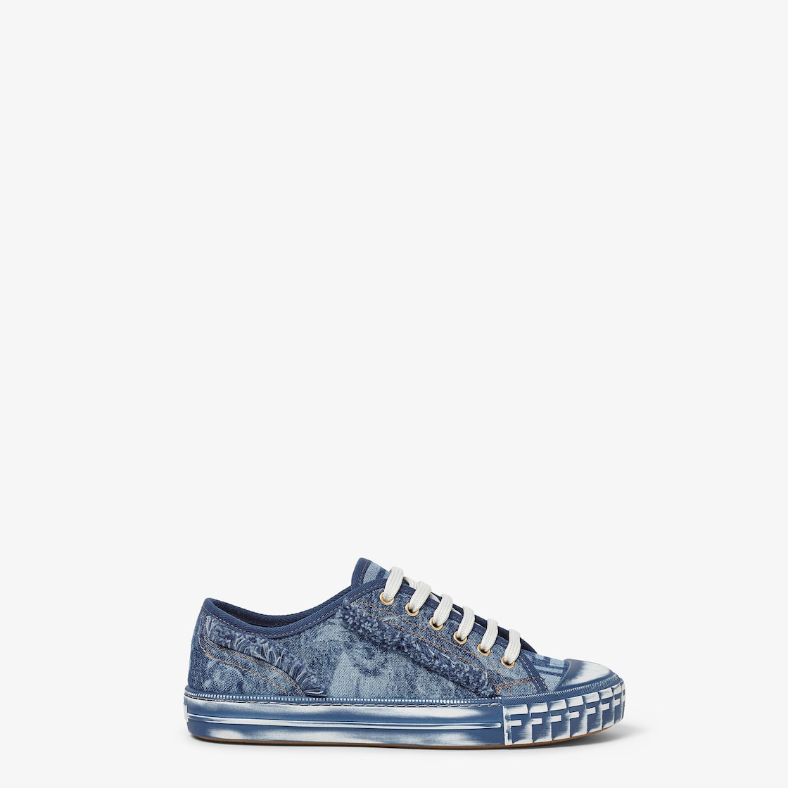 러버 컵솔 디테일 도미노 스니커즈. 다크 블루 컬러 코튼 데님 소재. 은은한 대조를 이루는 컬러의 씨 가든 모티프 프린트, 텅의 매칭 FF 모티프. 옆면과 힐의 쇼트 프린지 및 매칭 그로그랭 리본 트리밍. 블루 컬러 마크를 더한 러버 솔은 엠보싱 텍스처의 조합이 돋보이며, 토의 FF 패턴과 힐의 펜디 로마 로고가 특징입니다. 엑스트라 화이트 레이스.Made in Italy