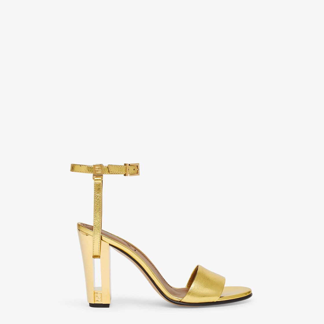 앵클 스트랩 디테일 델피나 라운드 토 샌들. 골드 컬러의 라미네이트 가죽 소재. 컷아웃 디테일과 골드 컬러 메탈 FF 모티프의 힐.