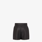 스트레이트 컷 쇼츠. 옆면의 사선 포켓. 컨실드 지퍼와 후크 잠금. 블랙 컬러의 부드러운 해머드 가죽 소재. 웨이스트에 엠보싱 셀러리아 마이크로 스티치 장식.