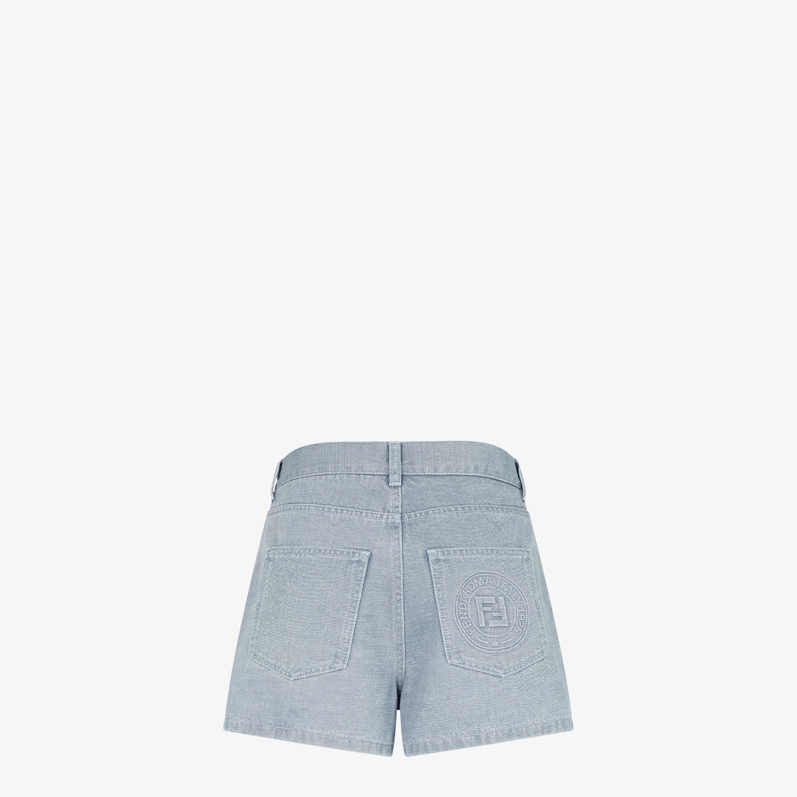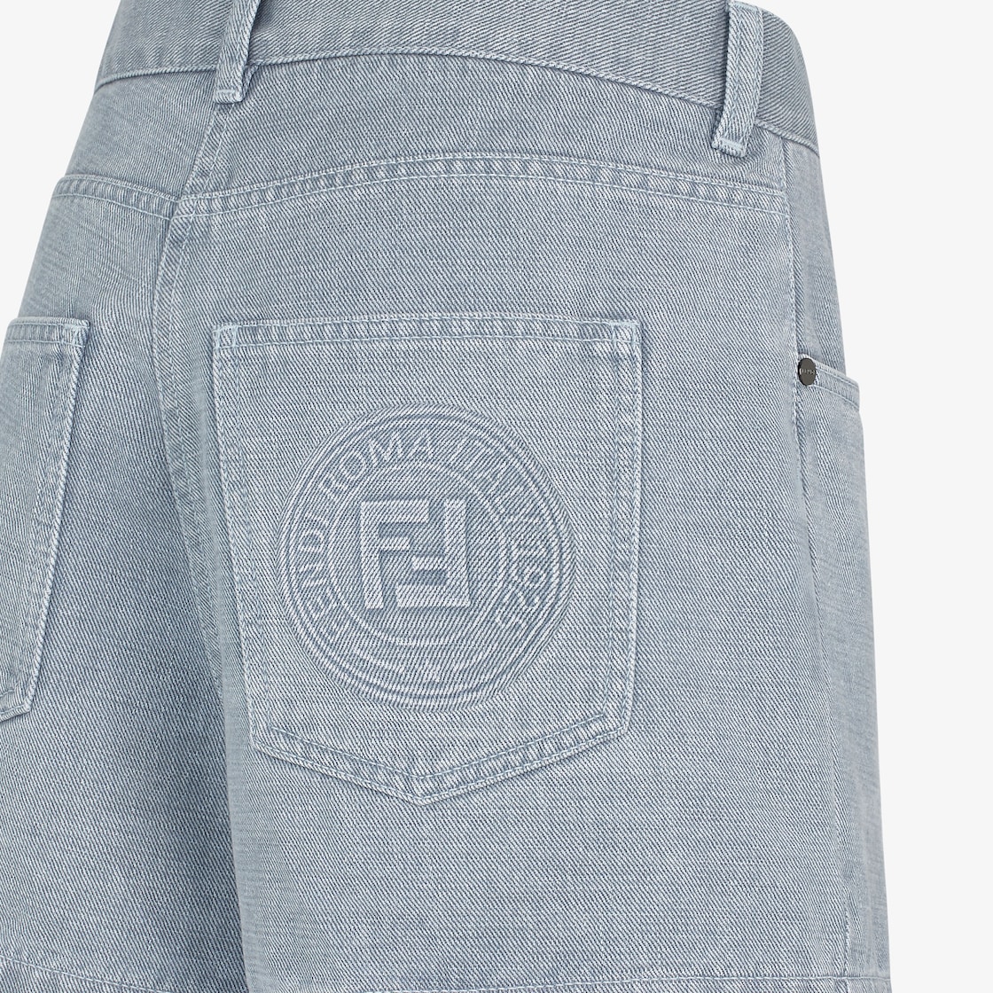 플레어 파이브 포켓 쇼츠. 허리의 벨트 루프. 컨실드 지퍼 및 로고 스터드 버튼 잠금. 라이트 블루 컬러의 데님 소재. 뒷면 오른쪽 포켓의 펜디 스탬프 1925 패치로 맞춤 디자인. 톤온톤 스티치 및 메탈 리벳.