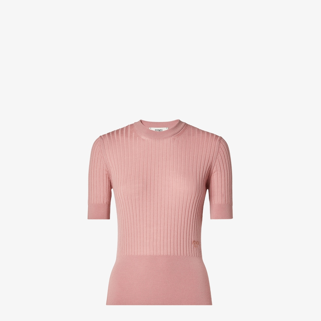 피티드 쇼트 슬리브 크루넥 스웨터. 핑크 리브 울 털실 소재. 앞면의 털실 자수 로고 맞춤 디자인.