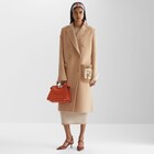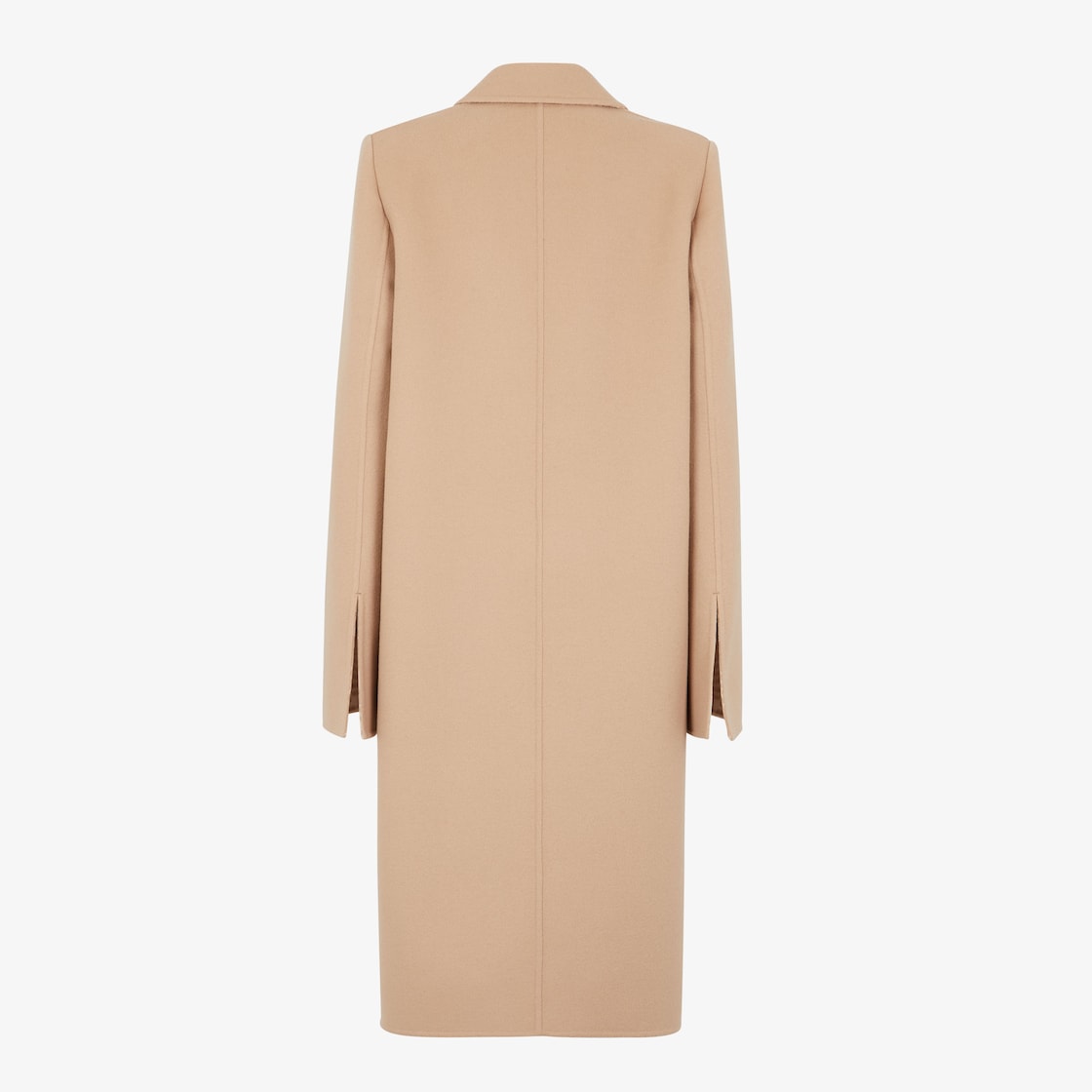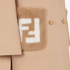 스트레이트 컷 미디 코트. 밑단 옆면의 슬릿. 피크 라펠, 가슴 포켓 및 패치 포켓. 버튼 잠금식 더블 브레스티드 스타일. 베이지 컬러 더블 페이스 울 패브릭 소재, 매치되는 컬러의 FF 모티프 라이닝. 화이트 컬러 FF 인레이 브랜딩을 더한 라이트 브라운 컬러 밍크 포켓. FF Karligraphy 로고 버튼.
