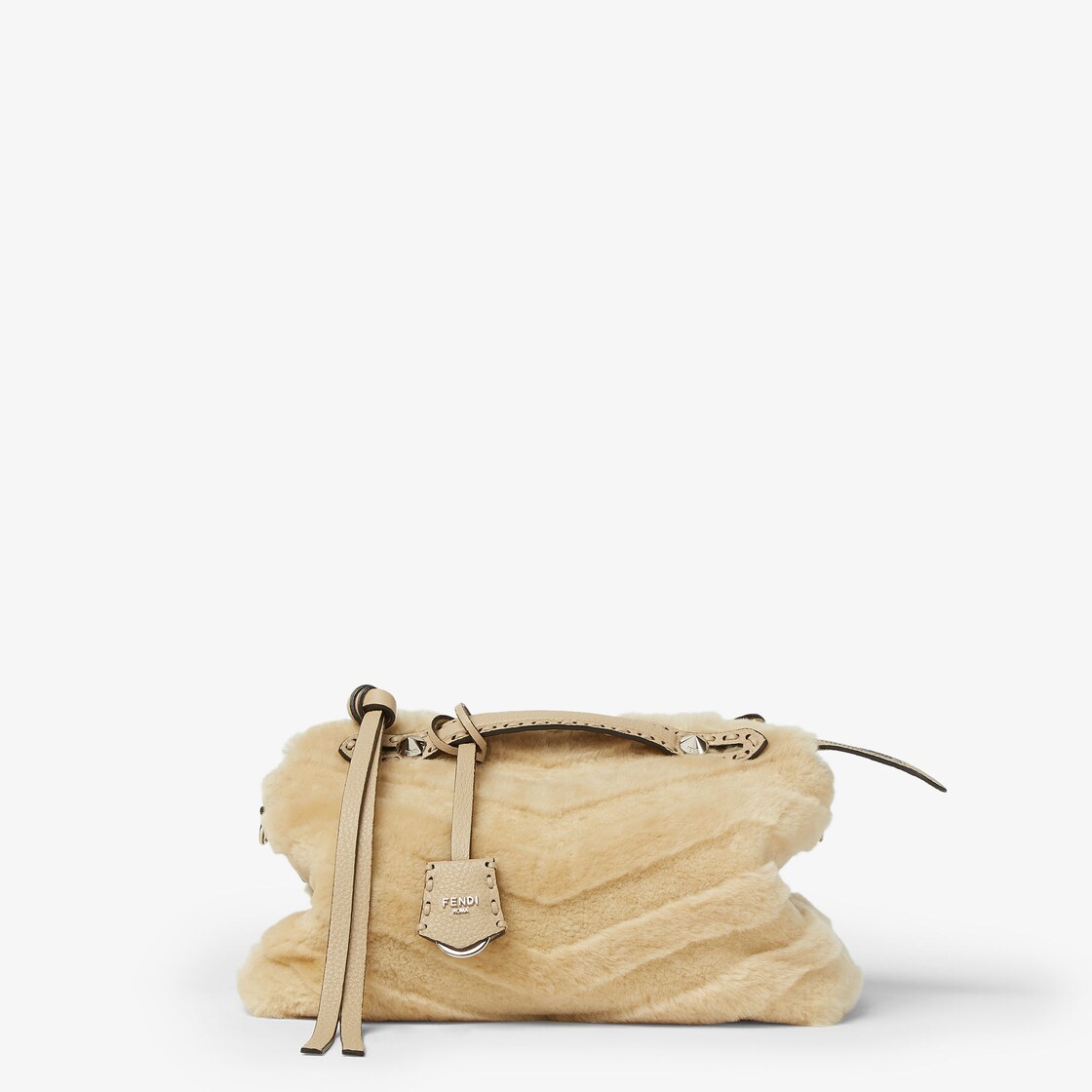 베이지 컬러의 시어링 소재. 입체감과 쉐이브 텍스처를 번갈아 연출한 셰브론 모티프. 톤온톤 로마노 가죽 디테일.