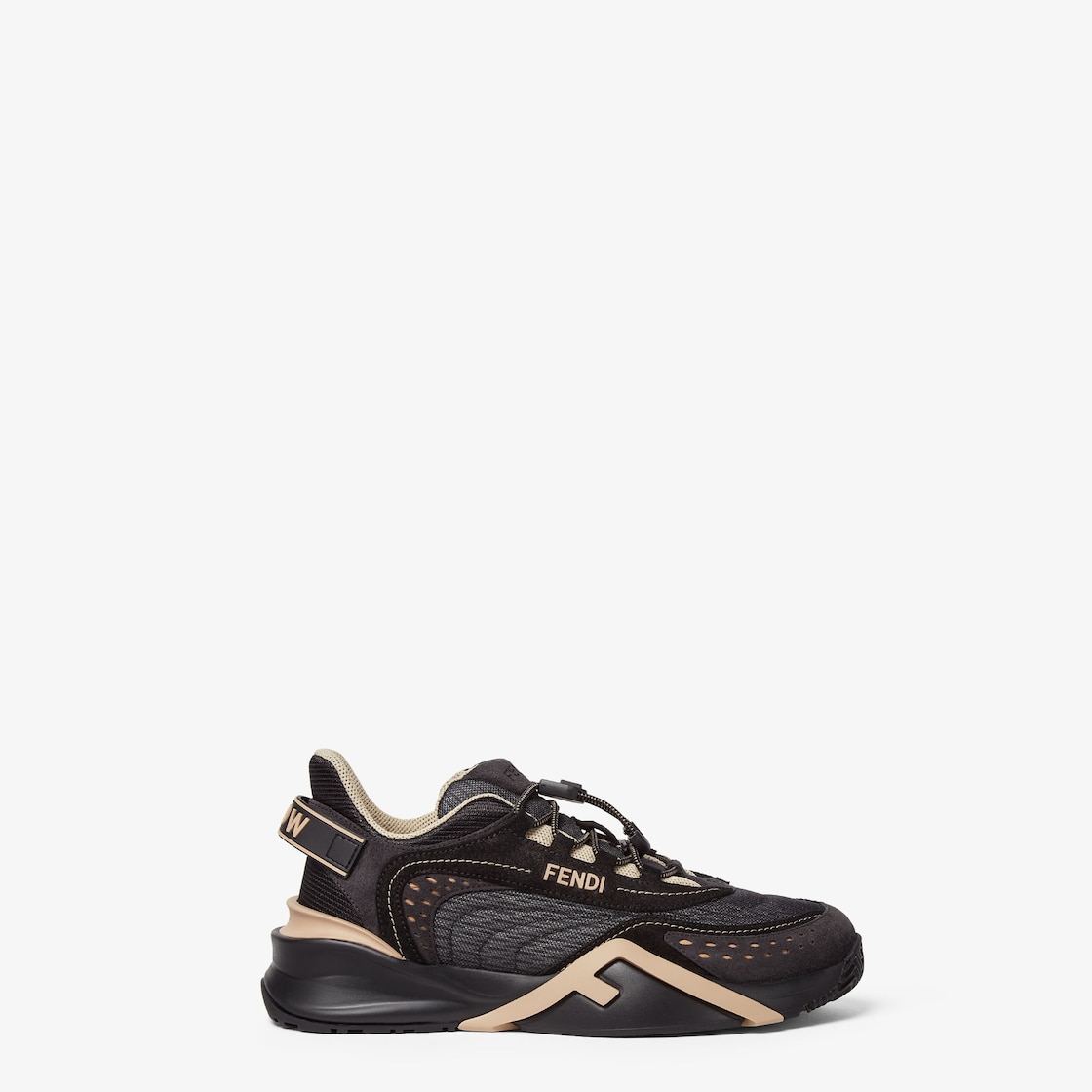 펜디 플로우 스니커즈. 신축성 있고 조절 가능한 레이스와 드로스트링 잠금. 텅과 러버 탭의 스웨이드 라벨 및 엠보싱 FF 맞춤 디자인. 힐 뒷면의 엠보싱 로고. 블랙 컬러 테크니컬 메쉬 소재, 톤온톤 스웨이드 및 가죽 인서트. 러버 디테일. 35mm 러버 러닝 솔. 베이지 사선 F 디테일.